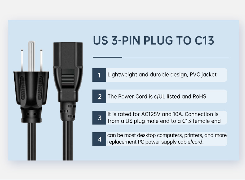 * The Power Cord is c/UL listed and RoHS compliant to ensure a safe and quality connection.